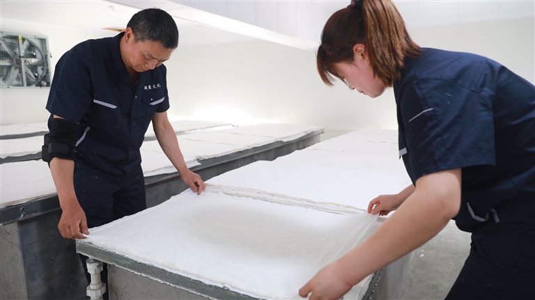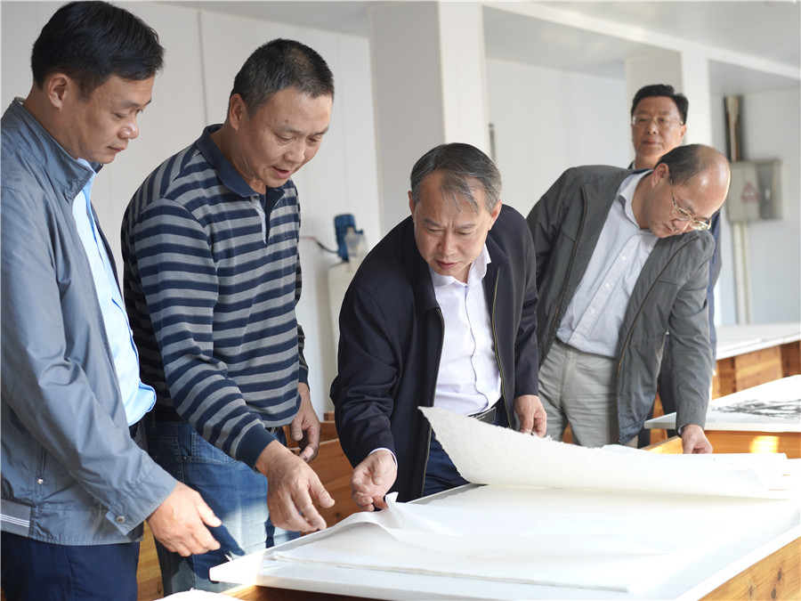10月9日下午,縣長(zhǎng)吳云忠赴海陽(yáng)鎮(zhèn)凝霜文化發(fā)展公司調(diào)研徽州楮皮紙傳承與發(fā)展工作,縣委常委、海陽(yáng)鎮(zhèn)黨委書記金學(xué)年,縣委常委、縣政府副縣長(zhǎng)程衛(wèi)華參加調(diào)研活動(dòng)。 吳云忠一行實(shí)地察看了徽州楮皮紙生產(chǎn)工藝流程,認(rèn)真聽(tīng)取企業(yè)負(fù)責(zé)人介紹,詳細(xì)詢問(wèn)徽州楮皮紙制作工藝